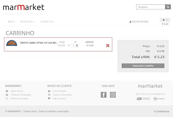 Clicando no mini-carrinho acederá à página do carrinho onde pode visualizar os artigos nele contidos, alterar quantidades ou retirar artigos .