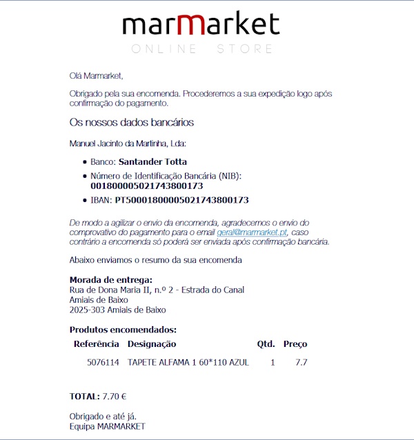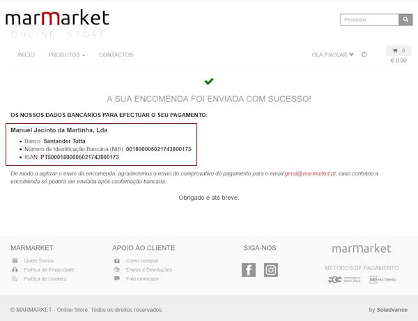 Após "CONFIRMAR ENCOMENDA" ser-lhe-á apresentada a página de sucesso com a indicação dos dados para pagamento . Receberá também um email nosso com os dados da sua encomenda e os respetivos dados para pagamento .
